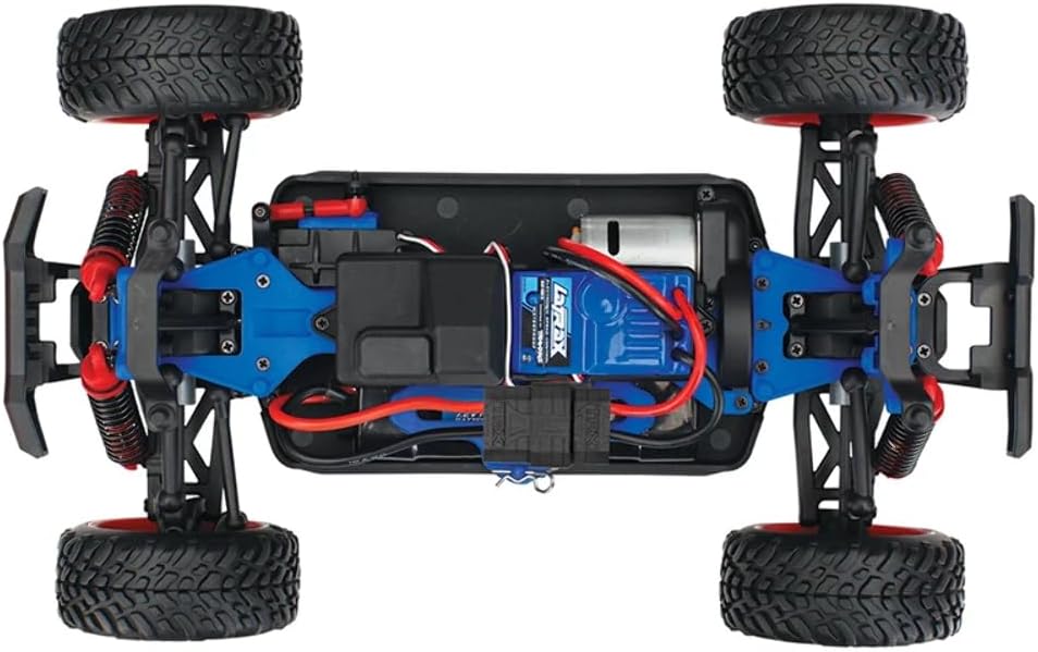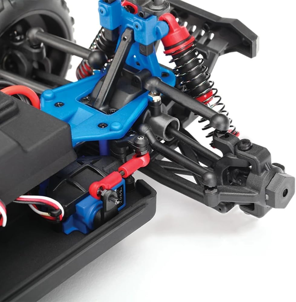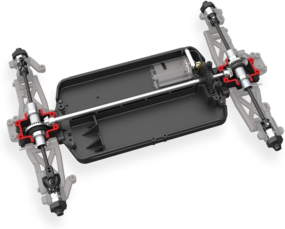 - Features: Chassis: Molded composite nylon monocoque Drive: Shaft. four-wheel drive for maximum traction with an aluminum center driveshaft Transmission: 10T Pinion / 60T Spur gear Radio: 2.4GHz. servo reversing. low battery indicator and electronic steering trim control. with 3-Channel micro receiver fully protected by a patented weather-sealed receiver box Steering servo: Integrated. High torque. waterproof sub micro design Steering: Bellcrank Electronic Speed
