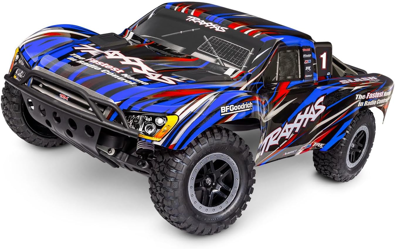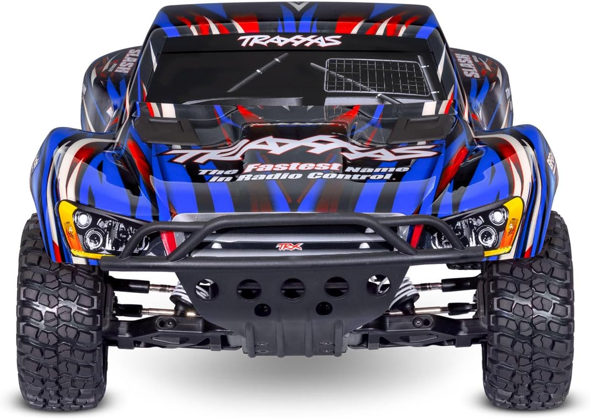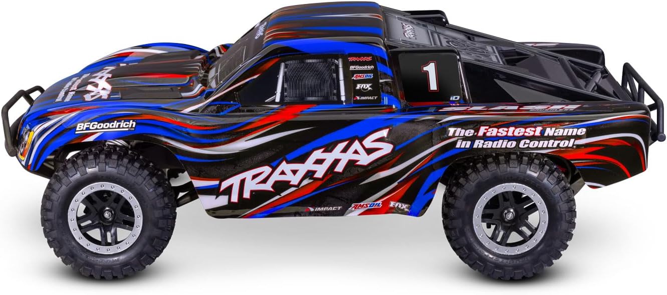 Traxxas Slash puts you in the driver’s seat for intense fender-to-fender short course racing action at the track. or in your own backyard. Slash’s BL-2s brushless power system delivers effortless power for all-day fun with a more responsive throttle and powerful acceleration. New Extreme Heavy Duty Upgrade parts allow Slash to take brutal punishment in stride. Slash’s fully adjustable track-ready suspension delivers most authentic short course racing experience possible.