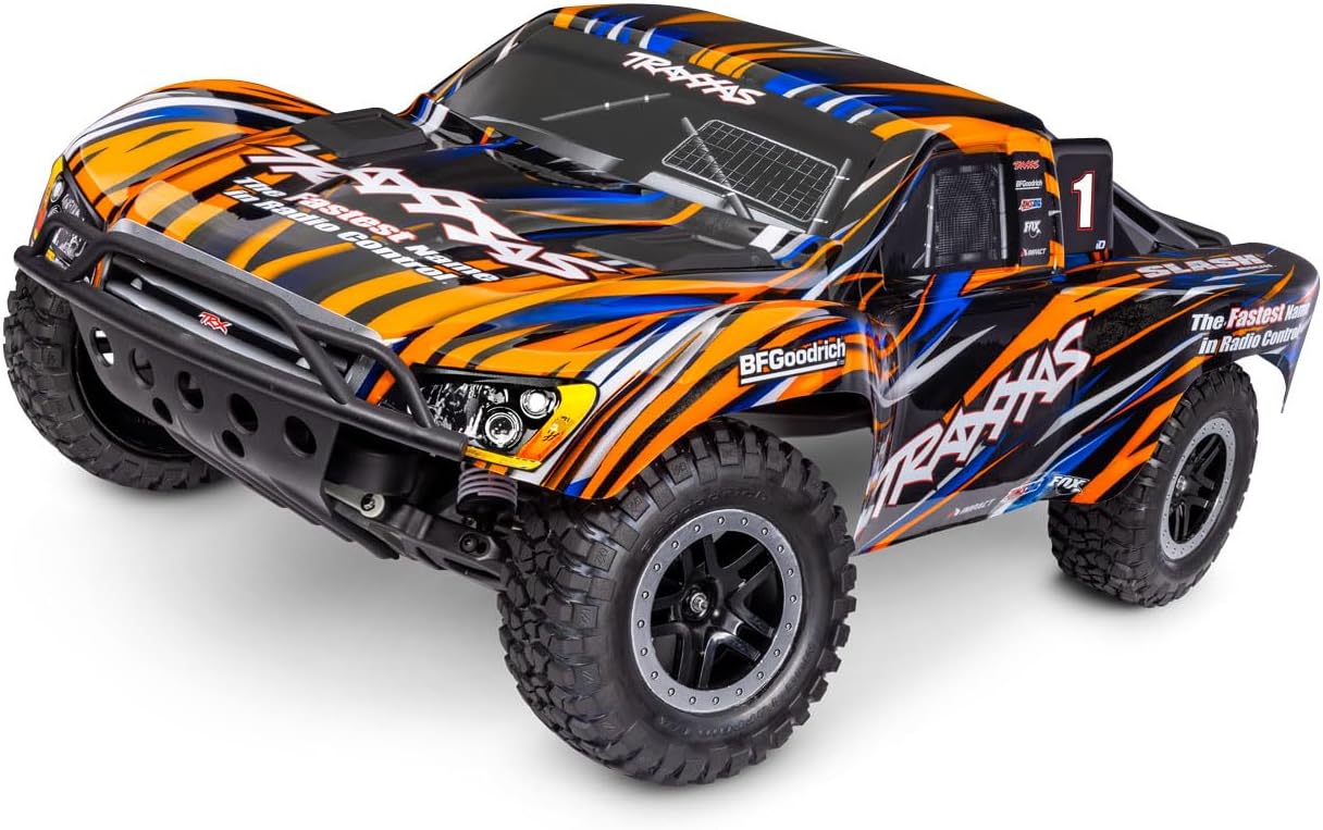 Traxxas Slash puts you in the driver’s seat for intense fender-to-fender short course racing action at the track. or in your own backyard. Slash’s BL-2s brushless power system delivers effortless power for all-day fun with a more responsive throttle and powerful acceleration. New Extreme Heavy Duty Upgrade parts allow Slash to take brutal punishment in stride. Slash’s fully adjustable track-ready suspension delivers most authentic short course racing experience possible.