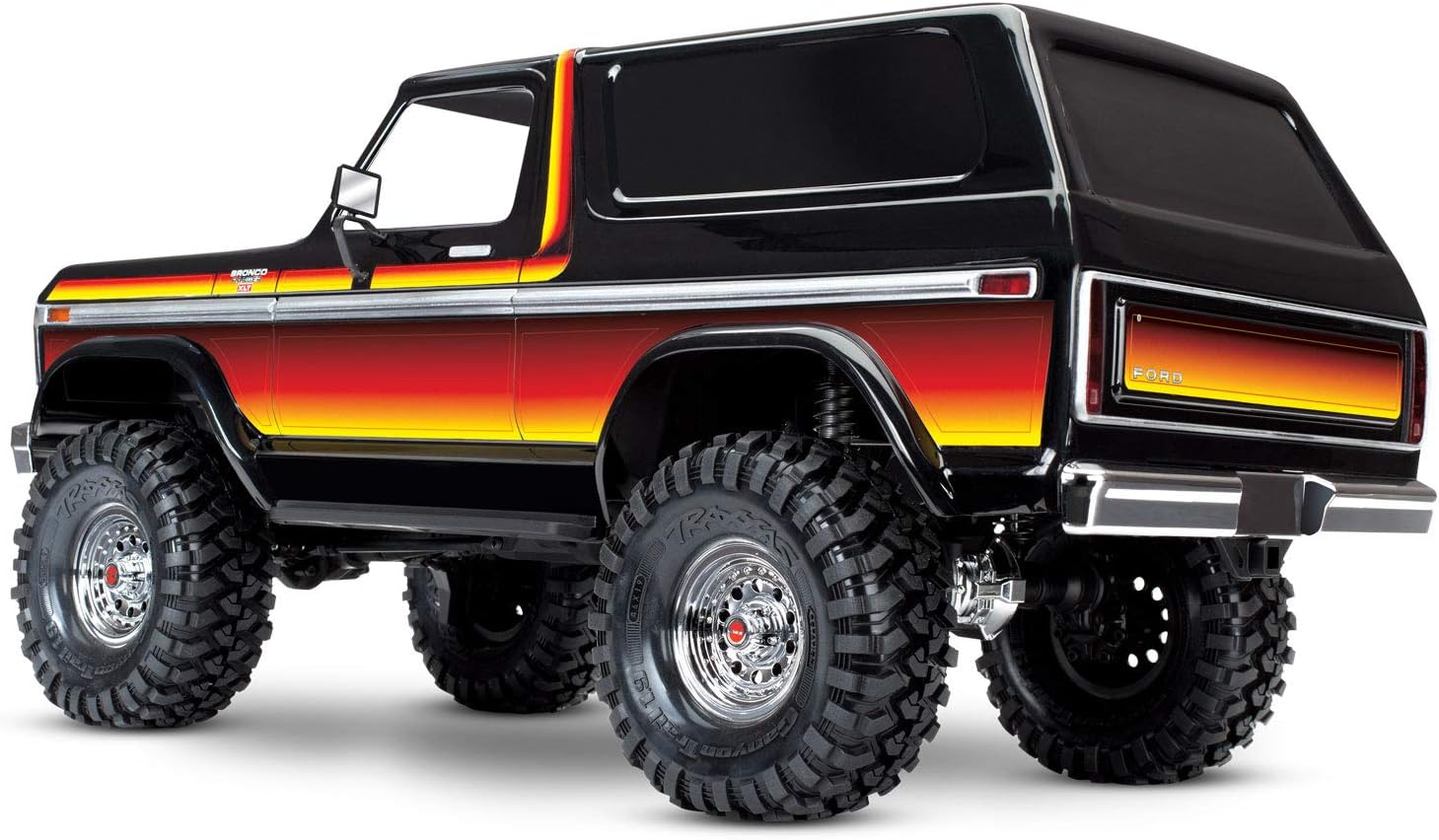Originally introduced in 1966 as a 4X4 compact SUV. the Ford Bronco matured as a full-size truck in the late 1970s. cementing its status as a rugged off-roader. Traxxas honors the classic 1979 Ford Bronco with this beautifully detailed and faithful reproduction mounted on the incredibly capable TRX-4 chassis. From the chrome wheels and bumpers to the gorgeous Sunset or red graphics. the TRX-4 recaptures the Bronco’s iconic era with the toughness and technology that could only come from Traxxas.