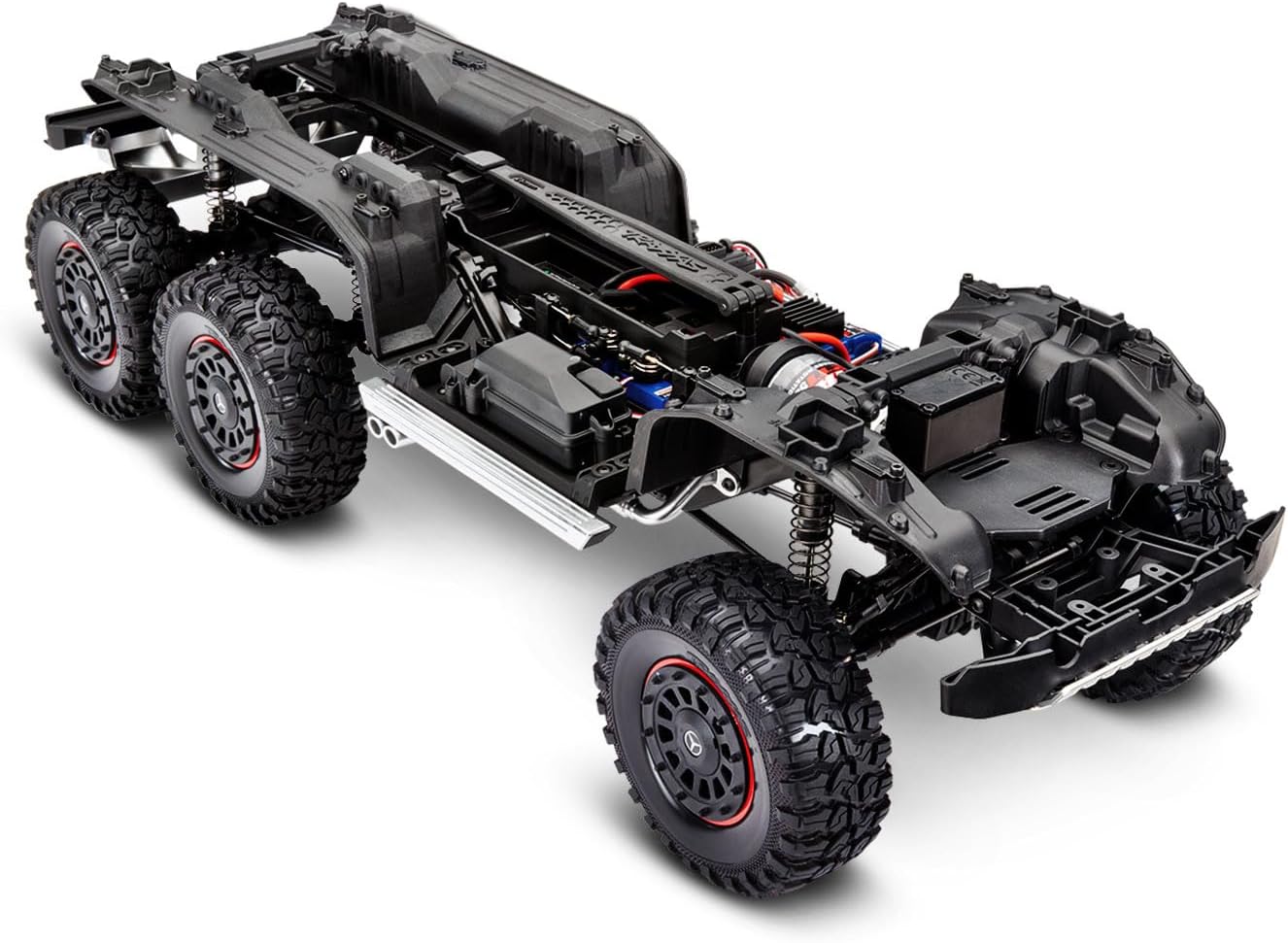 The Mercedes-Benz G 63 AMG 6×6 represents a singular vision to create the boldest and toughest all-terrain vehicle ever. Traxxas captures the spirit and no-compromise approach of the Mercedes-Benz G 63 AMG 6×6 with an officially licensed detailed scale replica built on the proven TRX-6 platform. Six drive wheels. three T-Lock remote-locking differentials. portal axles. high/low transmission. 6 aluminum long-travel shocks. and a stunningly accurate clipless body with brilliant LED lighting make this the most advanced and capable RC crawler ever to hit the trail.